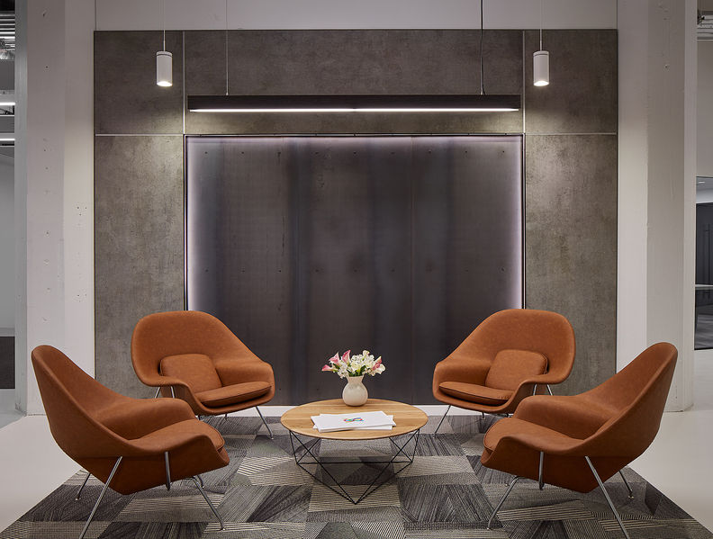 The most challenging aspect of the project was the need to work within very specific building parameters for the elevator lobby build out and the detailing the building perimeter engagement with new interior construction. With careful coordination, the design team developed a series of approved details to create perimeter offices and co-working spaces. A very low bank of ductwork informed the team of where to place tenant amenities and corridors